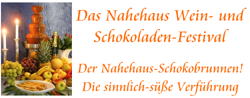 Der Nahehaus-Schokoladenbrunnen ist der dekorative und kulinarische Anziehungspunkt Ihrer Veranstaltung - nicht nur für Naschkatzen. Ihre Sinne werden vom feinen Schokoladengeruch verzaubert, der Gaumen von der zart schmelzenden Kakaomasse verwöhnt und das Auge isst im Besondern mit: Der fließende Strom aus Schokolade über mehrere Stufen des Brunnens ist ein echtes Highlight. Ein unvergessliches Erlebnis für Sie und Ihre Gäste! Schokolade schmeckt immer! Den Genuss zwischen Sinnlichkeit und Nostalgie genießen Sie mit unserem Schokobrunnen nicht mehr nur als privates, geheimes, sondern als gemeinsames, geteiltes Vergnügen. Lassen Sie sich und Ihre Gäste überraschen! Hochwertiger Wein - hochwertige Schokolade! Nur die richtige Nahehaus-Kombination verspricht einen ganz besonderen Genuss ... Gereifte, rote Gewächse zu einem Schokoladendessert - das ist in Frankreich bereits ein Klassiker. Edelsüße Knabberstücke und fassgereifte Ports gehören auch in England zum bewährten Pflichtprogramm, und die Italiener beglücken uns zum krönenden Abschluss eines Menüs oder für die Kaffeepause zwischendurch schon einmal mit einem Likörwein zu edler Schokolade. Der Kreis der "vionophilen Schokoholics" wächst. Schokolade macht glücklich. Die Speise der Götter Bereichern Sie Ihr nächstes Fest, Ihre nächste Unternehmenspräsentation mit dem Nahehaus-Genusserlebnis:
